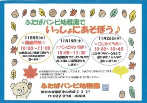 幼稚園の特色 幼稚園の紹介 年間の行事 預かり保育 未就園児教室 メニュー閉じる 幼稚園の特色 幼稚園の紹介 年間の行事 預かり保育 未就園児教室 お知らせ 🌸11月の未就園児教室・園庭開放🌸 未就園児親子ふれあい事業2025.10.20 11月の未就園児教室『バンビのひろば』『こじかくらぶ』『園庭開放』のおしらせです! ぜひご参加ください!(バンビのひろば・こじかくらぶは事前に申し込みが必要です☺) 一覧に戻る よくあるご質問 お問い合わせ 【所在地】〒989-3203 仙台市青葉区中山吉成二丁目2-27【TEL】022-278-0004